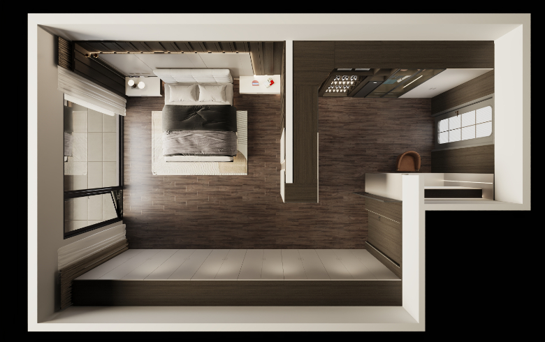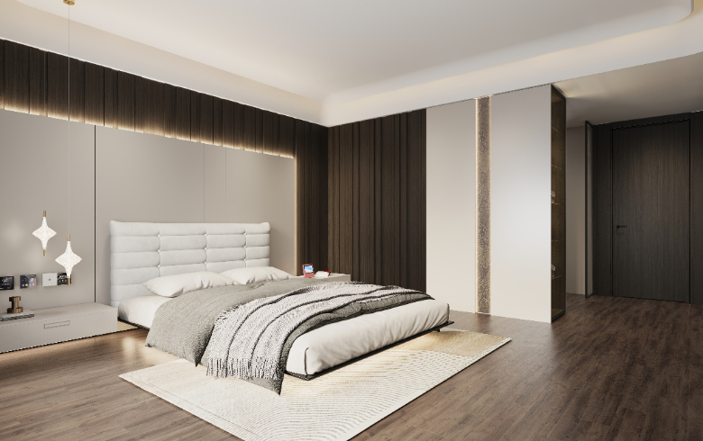 一字型通頂衣柜,搭配側(cè)邊開放格,放置帽子、包包等隨身飾物,懸浮床頭柜,節(jié)省空間,高級有格調(diào)。精細(xì)化設(shè)計,滿足四季衣物收納需求。