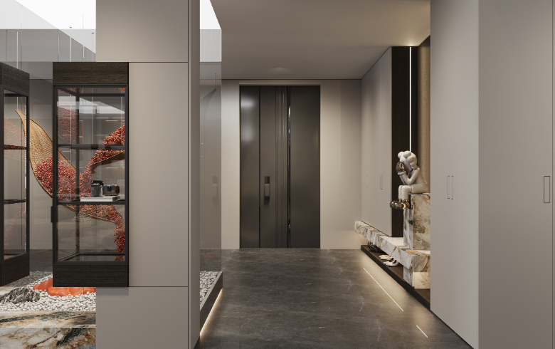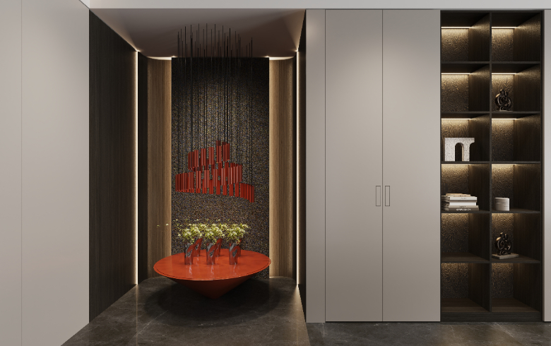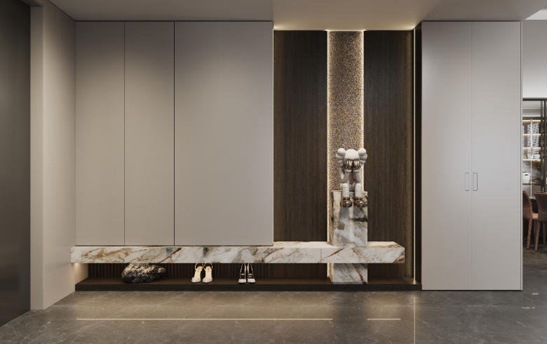 通頂玄關(guān)柜橫向延伸,收納翻倍。底部懸空方便換鞋,提升入門整潔度,地臺加持,高級加倍;中部鏤空開放,擺設(shè)飾品,放置出門必備物,生活的并井有條從歸家開始。
