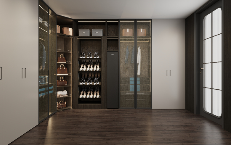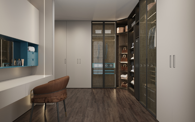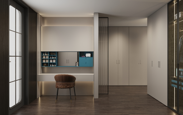 衣帽間設(shè)置梳妝臺,模塊化功能分區(qū),秩序井然,兼具實用性與視覺美,新穎別致的開放格設(shè)計,滿足Amy放置常用的護膚化妝品。