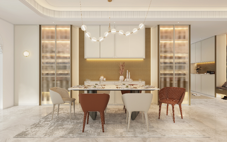 想空間不壓抑,左右對(duì)稱的餐酒柜柜門裝上長(zhǎng)虹玻璃,忽隱忽現(xiàn)的美感更誘人。