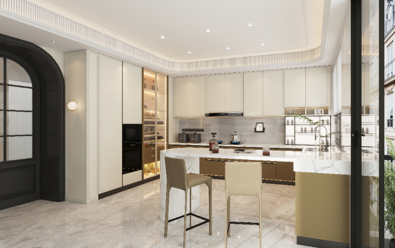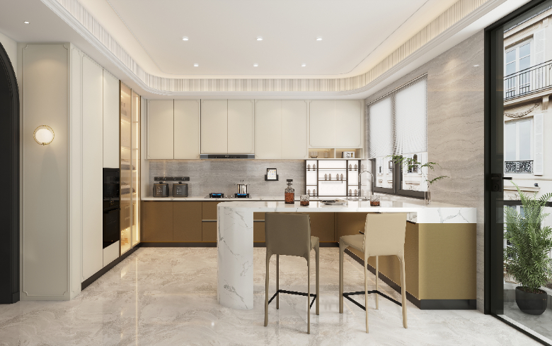 “烹"然心動(dòng)的廚房美學(xué),融入法式經(jīng)典特色,感受煙火烹飪的慢時(shí)光。開放式餐廚,L型櫥柜,煙火氣、精致感,樣樣不落下。地柜延伸出一個(gè)輕盈的小吧臺(tái),可以一邊品飲小酌,一邊等待料理煮好端上桌,非常浪漫的享受~