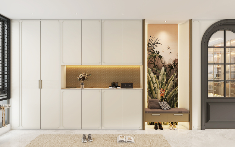 古典的優(yōu)雅氣場(chǎng),融入自然的生機(jī),靜待時(shí)光歲月靜好。入戶柜由高柜和懸浮柜組成,足夠放下一家人的鞋子,還可以收納家政雜物。