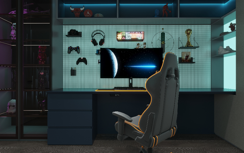 可升降電腦桌,不管站著工作還是坐著休息,都能輕松調(diào)節(jié)到最舒適的高度。屏幕后面及上方的空間也沒有浪費(fèi),既做了洞洞板收納一系列的電競(jìng)外設(shè)裝備,又在上面的開放格放置各類手辦,點(diǎn)綴單調(diào)的墻面空間,兼具美觀和實(shí)用性。
