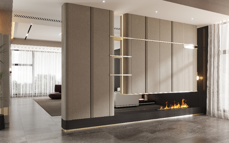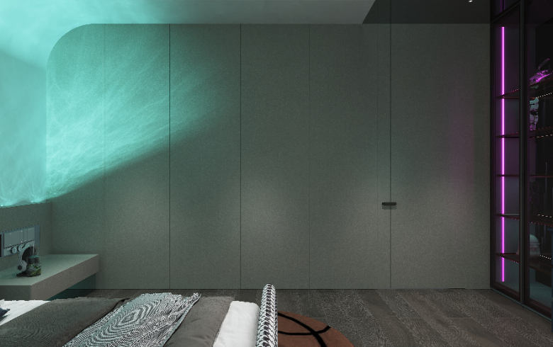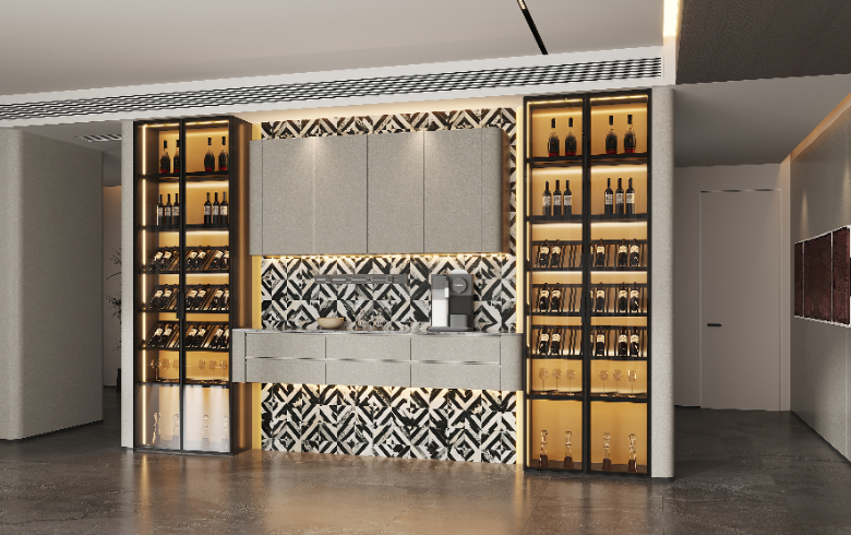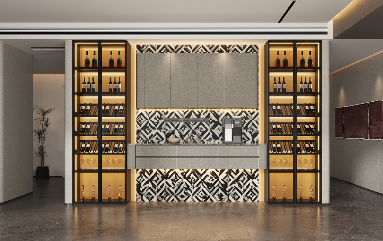 一字型餐酒柜,左右對(duì)稱,吊柜+中部鏤空區(qū),藏酒區(qū)與收納置物區(qū)兼得,3D打印裝飾畫背板融入隱形燈帶,調(diào)和視覺,打造業(yè)主宅家社交場(chǎng)。