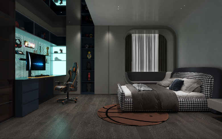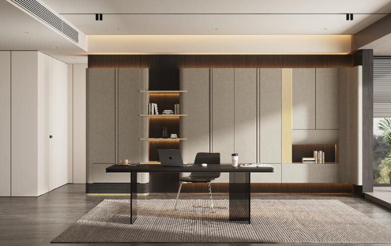 一側(cè)設(shè)計(jì)成懸浮書柜,輕盈時(shí)尚,打破整墻書柜的厚重壓抑感,讓學(xué)習(xí)工作更輕松有趣。