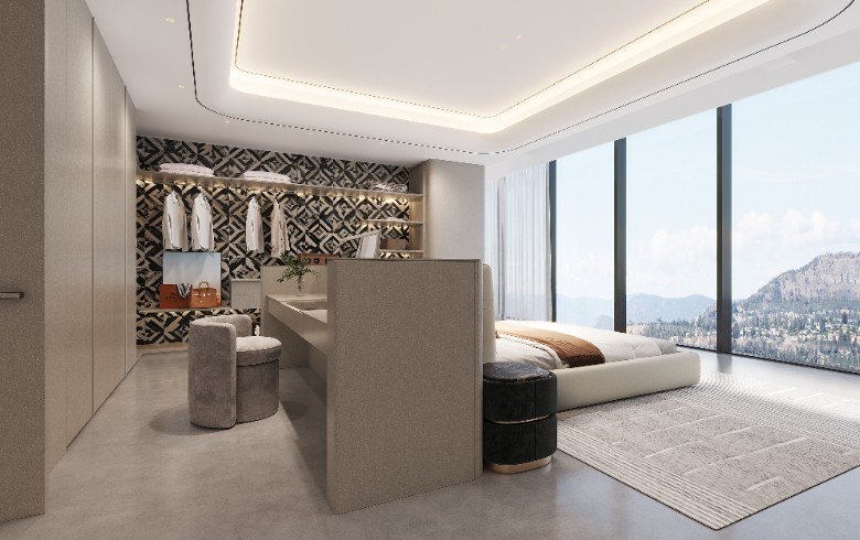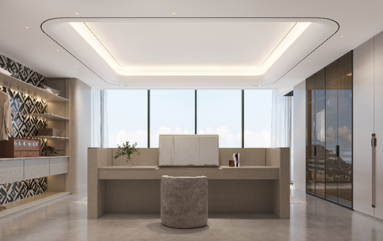 臥室空間大,床頭可以不靠墻,使用一個(gè)梳妝臺(tái)隔斷,直接多出一個(gè)梳妝區(qū)域,梳妝臺(tái)靠近衣柜,日常換衣化妝都很方便,也節(jié)省了空間。