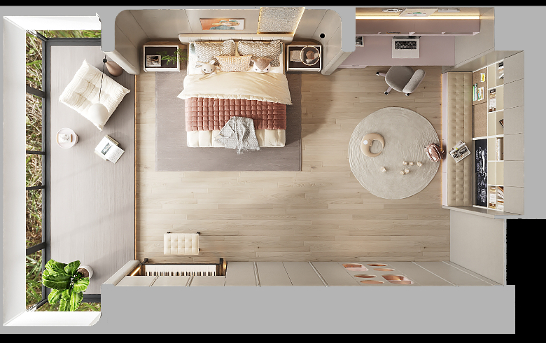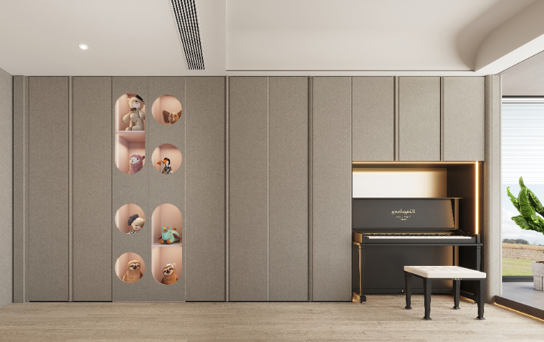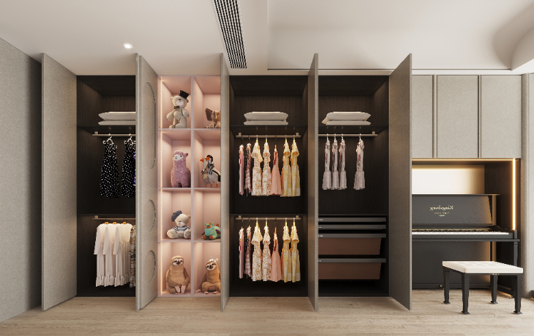 這是一個(gè)愛彈鋼琴的女孩的房間,設(shè)計(jì)師巧妙將鋼琴嵌入衣柜之中,上方吊柜還可以儲(chǔ)物,靠近落地窗,采光更充足,彈琴陽(yáng)光好心情。