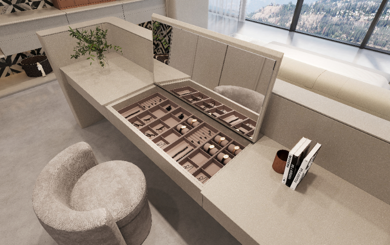 衣柜采用全屋定制高端工藝切半圓門板×圓形造型板,弧形造型加持,展示的飾品更CUTE,增加家居空間靈動(dòng)感和時(shí)尚感,營(yíng)造舒適居家氛圍。