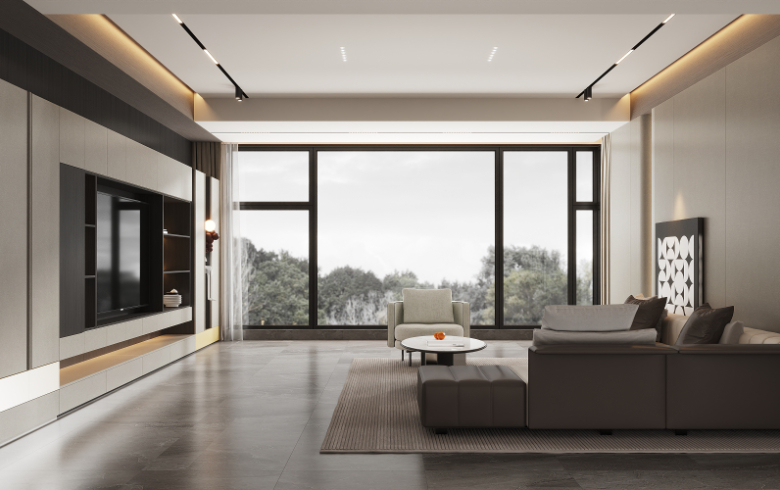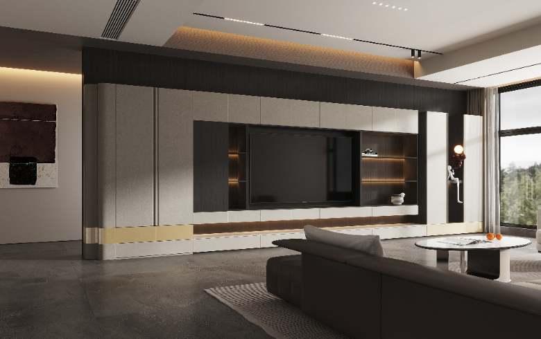 一字型滿墻電視柜,滿足收納與展示,視覺上更有連貫性。