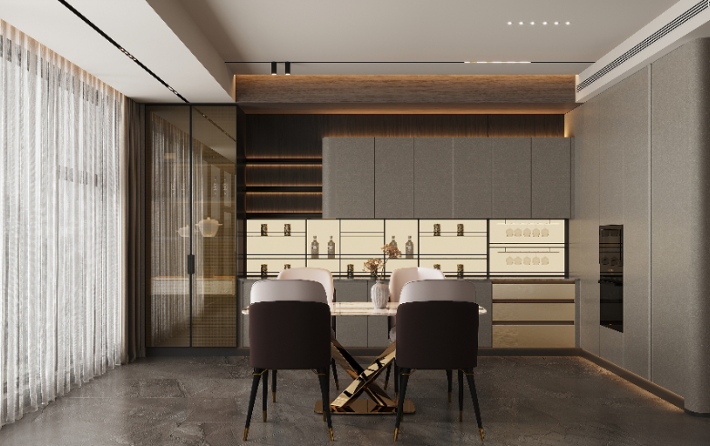 餐酒柜與餐邊柜,有效緩解廚房、餐廳、客廳的空間儲(chǔ)物壓力,搭配同色系餐桌椅,更有空間秩序感,氛圍更整體統(tǒng)一。