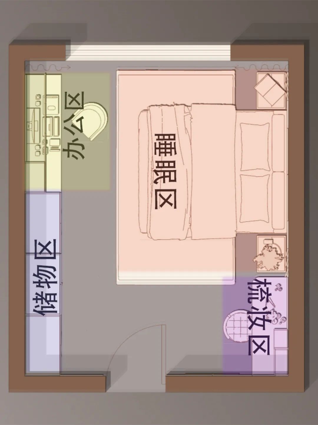 ??在布局上處于室內“黃金地段”房間的正中央,其他功能區(qū)域圍繞睡眠區(qū)展開。