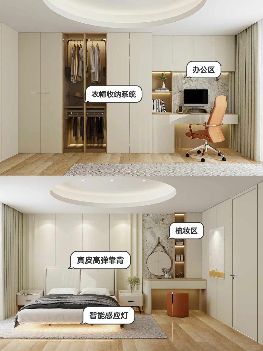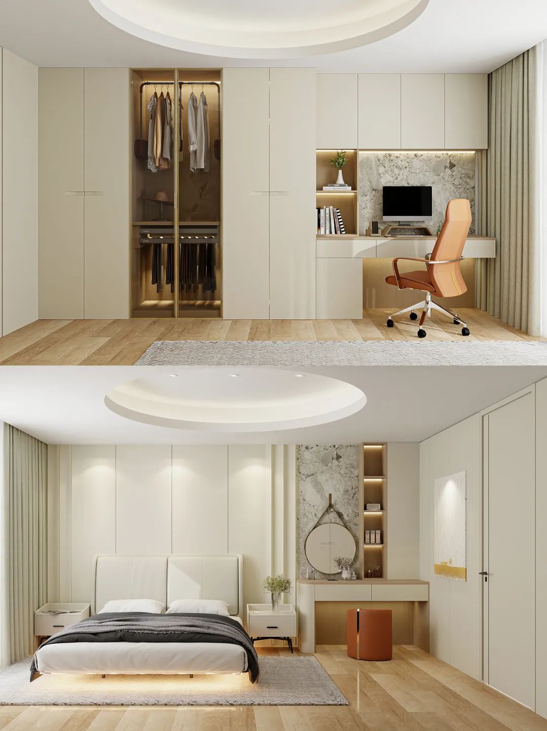 ??書桌柜與衣柜一體化設計,視覺效果更整體流暢,節(jié)省空間的同時也加大了儲物空間。