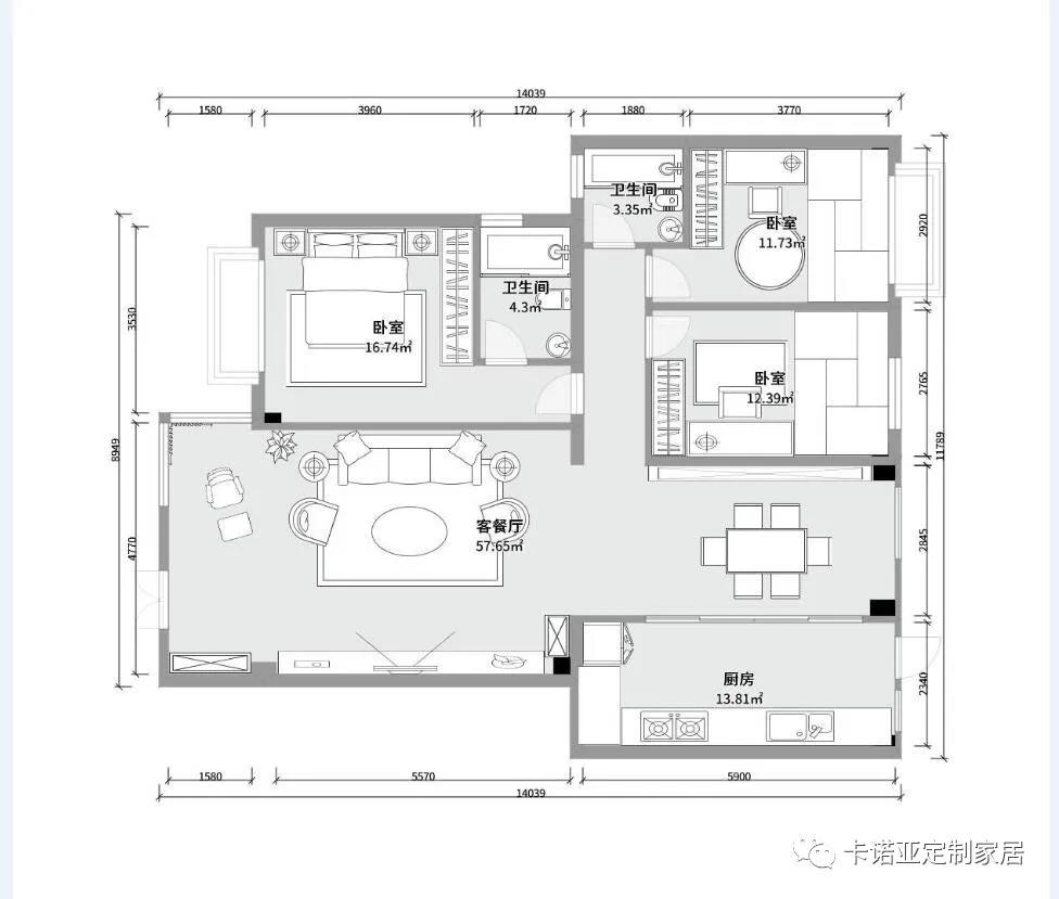 首先,將廚房擴(kuò)大改成玻璃推門(mén)增加自然光,其次利用窄墻做對(duì)稱(chēng)式入墻多功能餐邊柜,