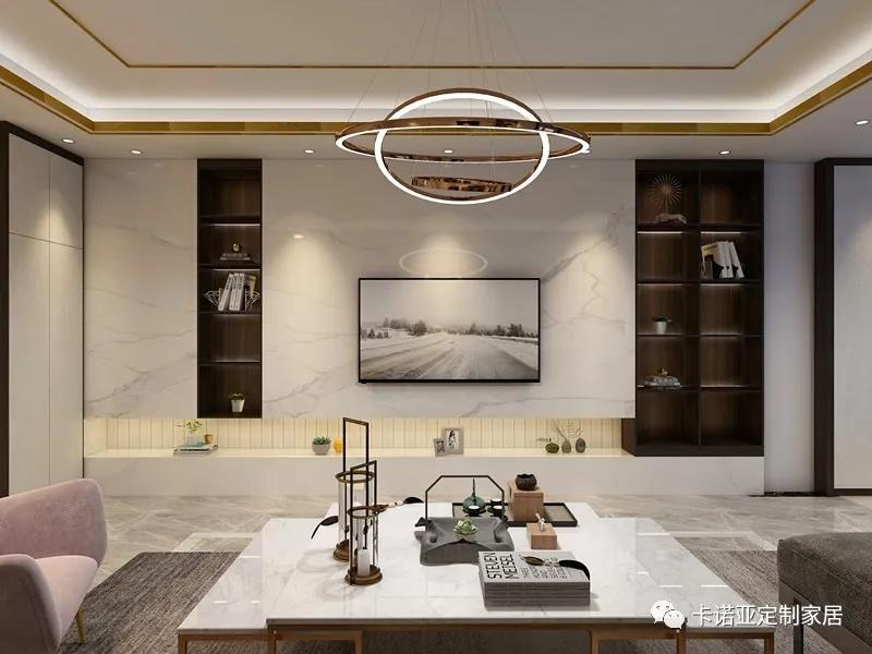 客廳選用偏北歐風(fēng)的裝飾元素,簡(jiǎn)約系漢白玉讓墻面更加簡(jiǎn)潔大氣。沙發(fā)靠枕和地毯等布藝品在白灰的大色調(diào)中,加入跳躍的粉紅做點(diǎn)綴,活潑亮眼。開(kāi)放格入墻式電視柜造型簡(jiǎn)潔,和一旁的黑色木門(mén)相互呼應(yīng)。電視機(jī)下面的鏤空設(shè)計(jì),擺放藝術(shù)飾品,墻內(nèi)燈帶設(shè)計(jì),讓極簡(jiǎn)空間明亮而溫暖