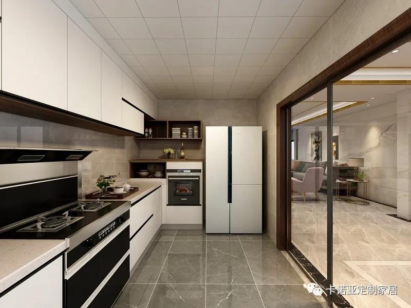 廚房與餐廳相連,中間采用玻璃推拉門(mén)隔開(kāi),