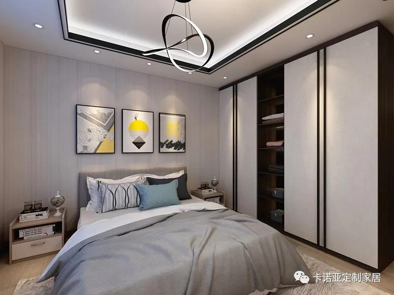 主臥選用了入墻式的開(kāi)門(mén)衣柜,容量大,造型美觀整體。淡灰色的墻面與床品的灰色系呼應(yīng)整體的黑白色調(diào),