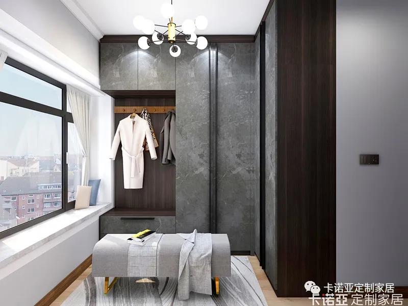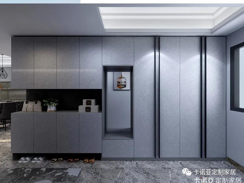 高級(jí)灰地柜+吊柜,柜體有藏有露,長(zhǎng)條形玄關(guān)極致利用,收納性很強(qiáng)。為了方便出門整理儀容著裝,設(shè)計(jì)了一面試衣鏡,凹進(jìn)去空間設(shè)置了換鞋凳。