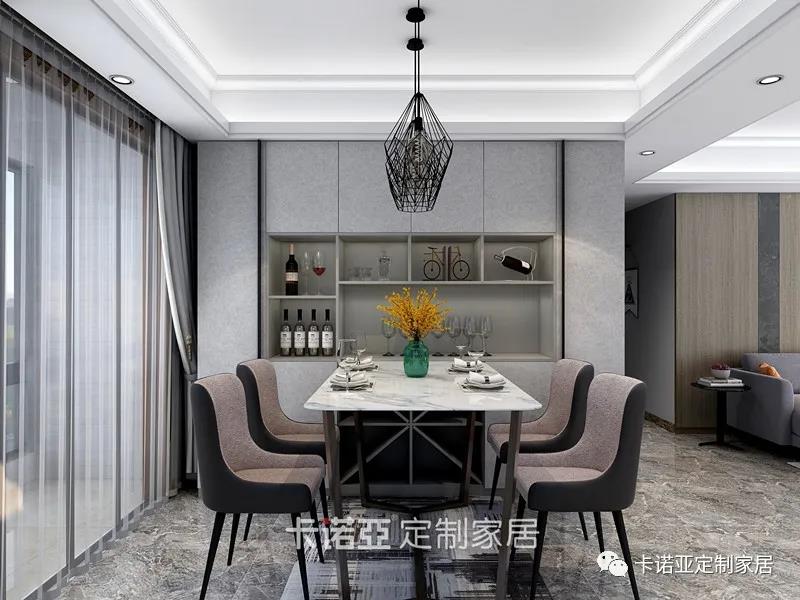 灰色系和粉色兩種撞色,柔和的燈光讓用餐環(huán)境更有格調(diào)。簡(jiǎn)潔的餐桌搭配灰色餐邊柜,高低錯(cuò)落,凹凸有致,讓餐廳更顯靈動(dòng)。