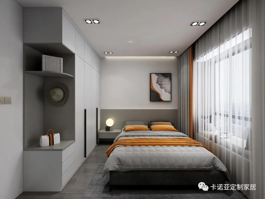 點(diǎn)綴橘黃色床品、窗簾及掛畫