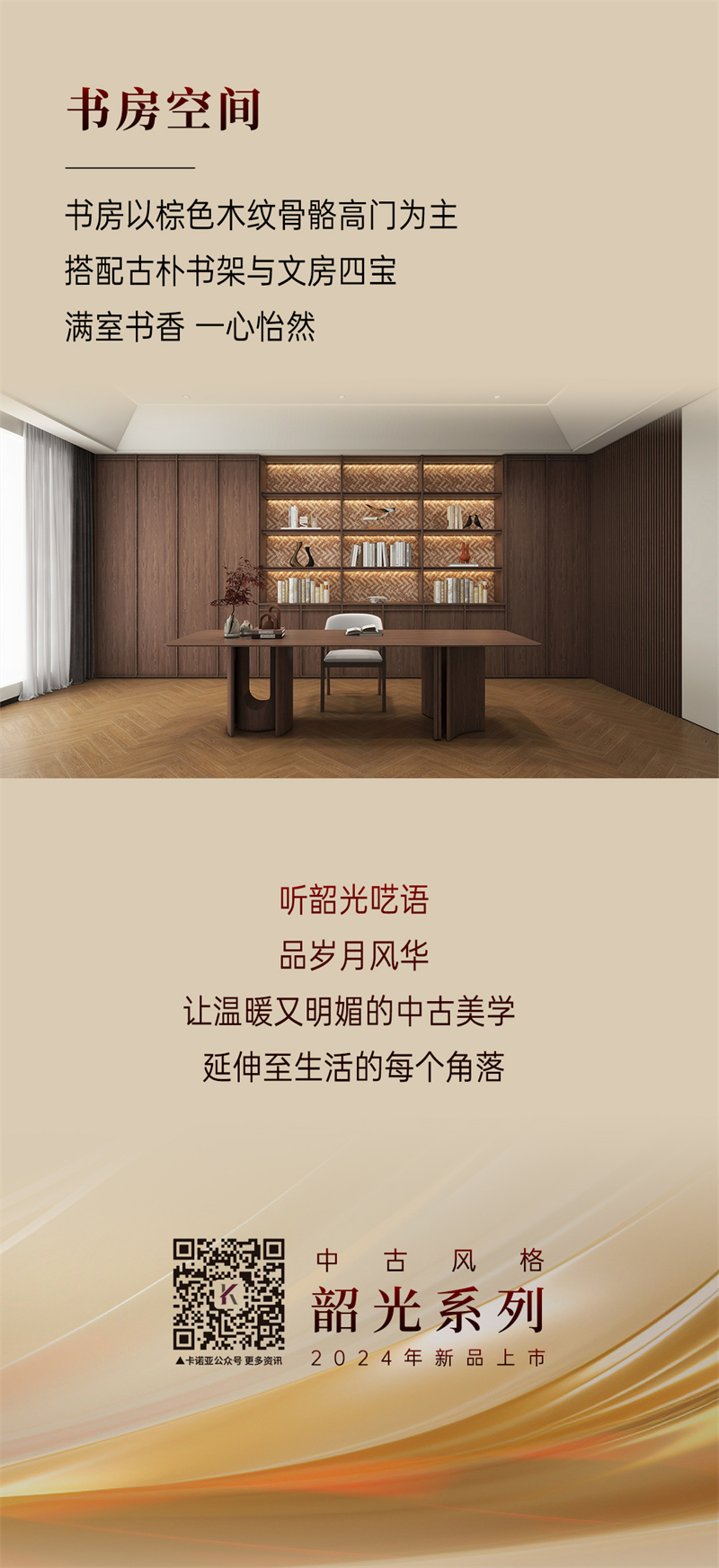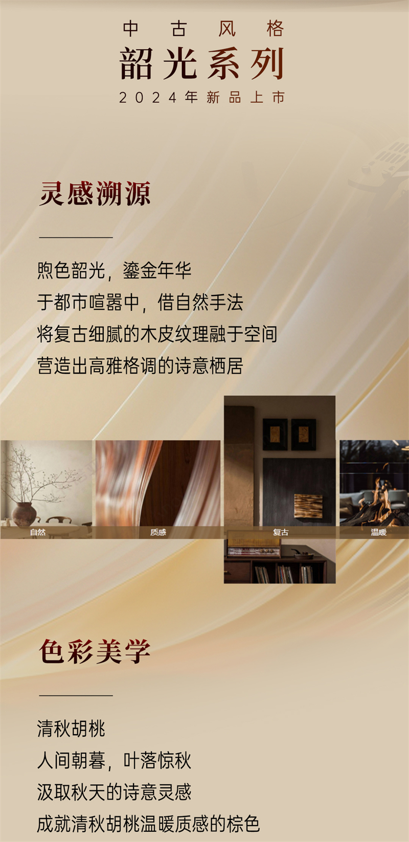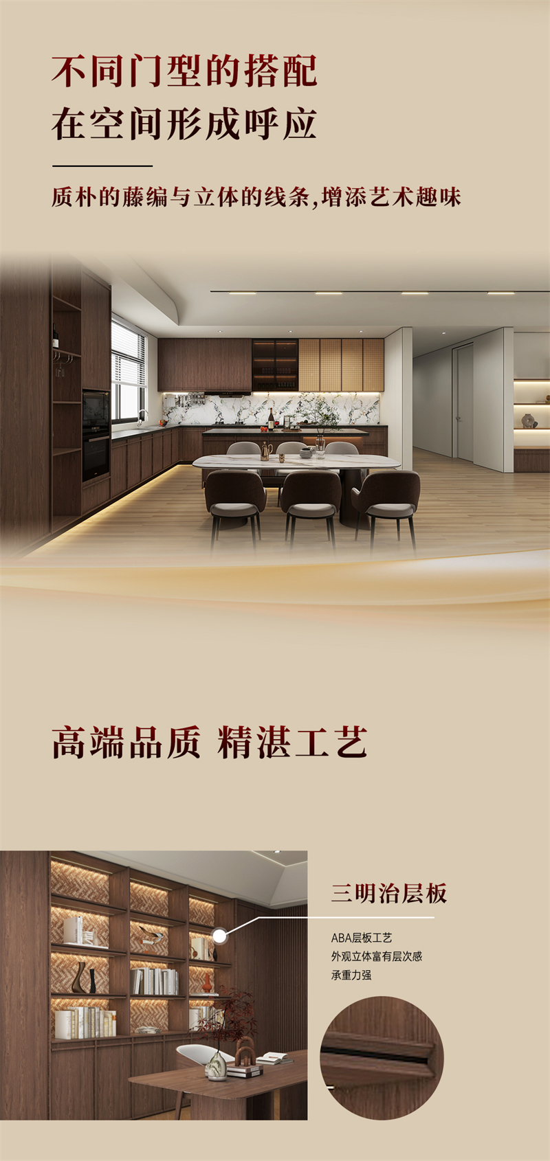 2024年新品系列,韶光 |中古風(fēng)棕色胡桃木紋為主色調(diào),搭配白色暗紋,細(xì)膩的藤編門與硬朗的骨骼門讓人聯(lián)想到古老的家具,充滿了歲月的痕跡。木紋的邊框+細(xì)密的藤編,自帶復(fù)古朦朧美感;拼樞門和藤門結(jié)合運(yùn)用,使整個(gè)空間透氣感強(qiáng),并擁有獨(dú)特舒適的慵懶氛圍。