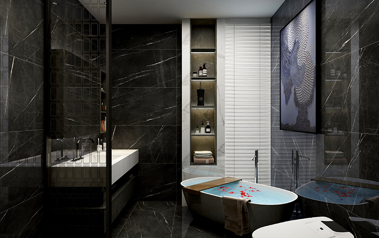“御品木”溫柔的木紋,碰撞3D大理石硬朗的石紋,極簡(jiǎn)“銀河黑”過(guò)渡,一起裝飾餐廳背景墻,打造尊榮的就餐儀式感。