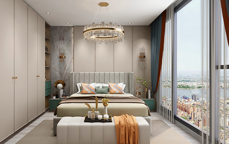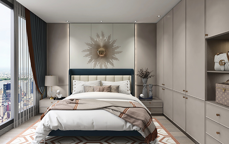 臥房大量應用淺色調(diào)“流光漫步、優(yōu)雅暖灰”,安定情緒,助力睡眠。床頭背景墻使用護墻板,隔音降噪,柔軟的絲絨床頭可以靠著看書,適合睡前閱讀。床頭柜加入跳躍的“電光墨綠”,讓臥室洋溢大自然氣息。床側(cè)定制靠墻衣柜,一側(cè)做成半開放式,更適合放置睡前常用物品。
