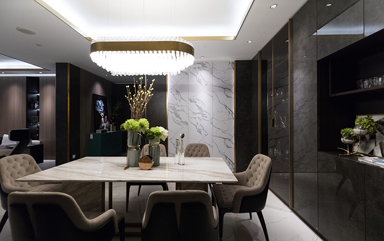 餐廳護(hù)墻板采用漢白玉搭配黑鉆灰,對(duì)比鮮明,視覺沖擊力震撼,中間采用黃銅金屬線條拼接,輕奢風(fēng)撲面而來。