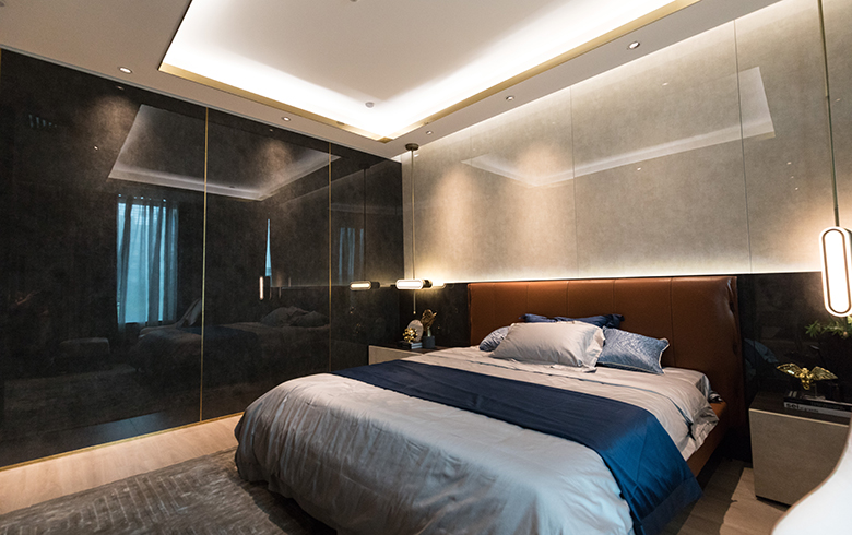 臥室護(hù)墻系統(tǒng)兩面采用深淺對(duì)比色,高亮光護(hù)墻板拼接,非對(duì)稱均衡設(shè)計(jì),幾何線型簡(jiǎn)雅觀感,造就輕快、高雅、奢華的生活品味。