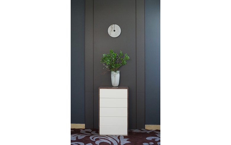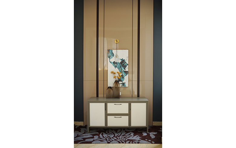 護墻板漢白玉的淺灰、墻面油漆的中性灰、大面積漢白玉護墻板拼貼的深色灰色塊,三種不同飽和度的灰和諧融合,白色點綴,演繹出美輪美奐的空間氣質,具有非常震撼的感染力。