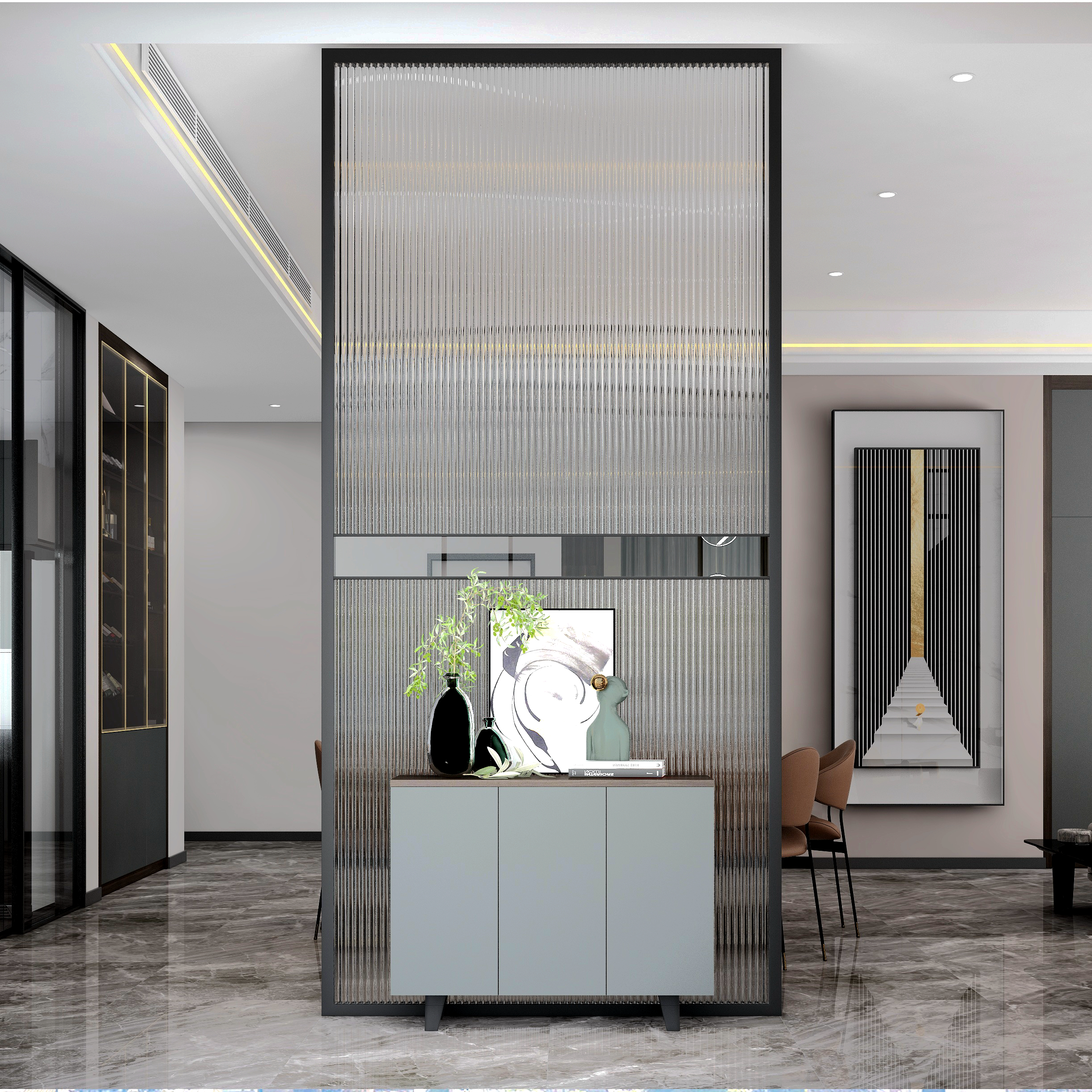 在接近夜幕時(shí)刻的傍晚,天空還帶著微微的晚霞,天空是霧蒙蒙的,泛著暖暖的光,暮色刻畫出來的棱角,不像深夜那么模糊,不像白天那么清晰,有一份恰好的柔和感又有一份溫柔的醉意。而我門這次方案的構(gòu)思,將設(shè)計(jì)方案定義為極簡(jiǎn)風(fēng)格,保留著黑白灰本有的色塊分明度,在色彩元素上增加了一些暖色調(diào),在材質(zhì)提現(xiàn)上摻入一些絲絨磨砂柔軟觸感的質(zhì)感搭配,緩和黑白灰的線條感,讓冷峻的空間感多一點(diǎn)生活的煙火氣息