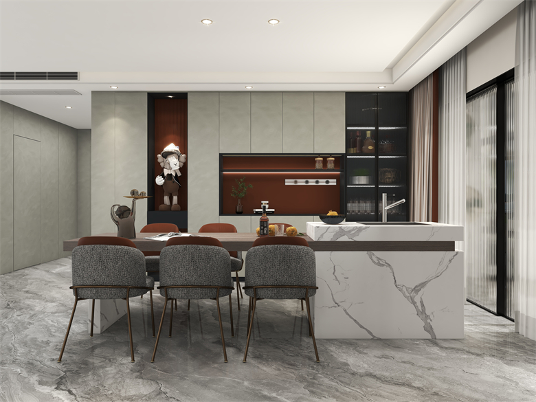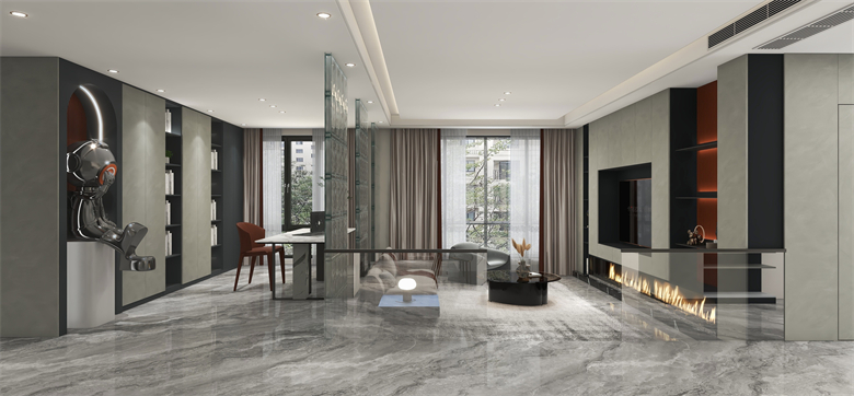 對(duì)于這套戶型的定義是實(shí)用的基礎(chǔ)上滿足業(yè)主時(shí)尚又年輕化的需求。整體空間從入戶到客餐廳都有一套強(qiáng)有力的流線進(jìn)行引領(lǐng)。比如燈光的運(yùn)用,材質(zhì)的拼接和反光的處理都更好的表現(xiàn)了空間的質(zhì)感和通透性。 空間的整體動(dòng)線為業(yè)主更好的規(guī)劃了日常生活的走向,根據(jù)對(duì)業(yè)主年輕化和職業(yè)的分析,在設(shè)計(jì)中添加了手辦裝飾以及對(duì)職業(yè)需求的一些理解。