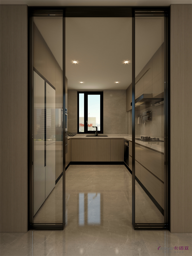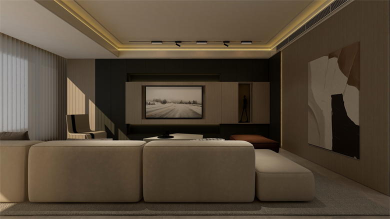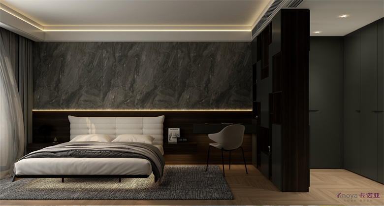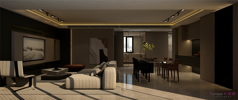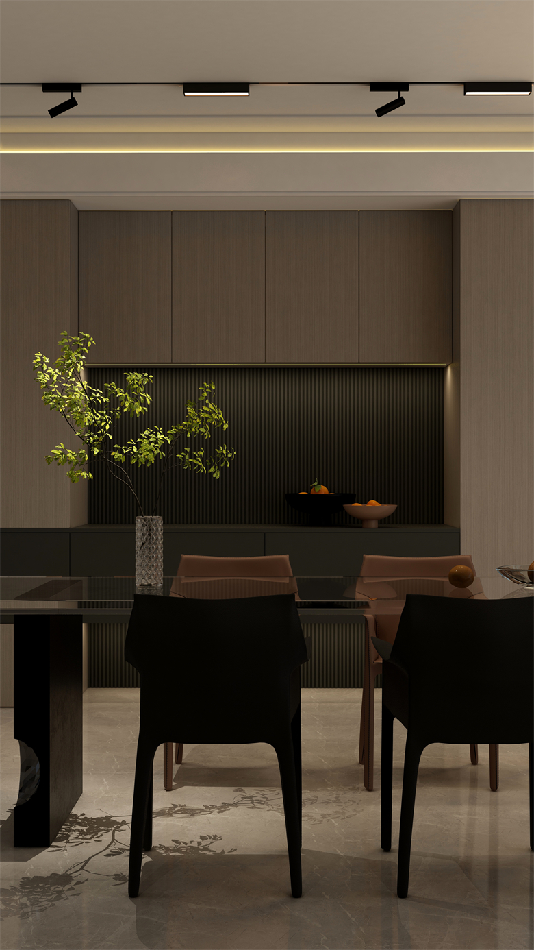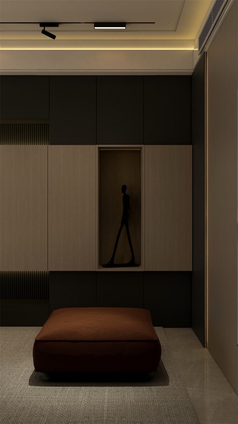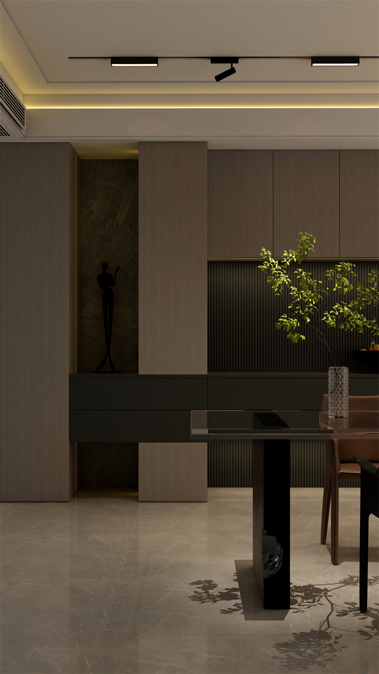本案設(shè)計圍繞業(yè)主意式極簡風(fēng)格的需求,主色調(diào)黑、白、灰、咖,多利用金屬色、木色、石材做出變化,點綴少量艷麗色。柜墻門一體化,采用穿插、進退等設(shè)計手法,配合燈光使空間簡潔又頗具設(shè)計美感。意式極簡風(fēng)格刪繁就簡,遠離一切浮華和不實用,從生活本質(zhì)出發(fā),以極簡的設(shè)計演繹出最本質(zhì)的輕奢美學(xué)。