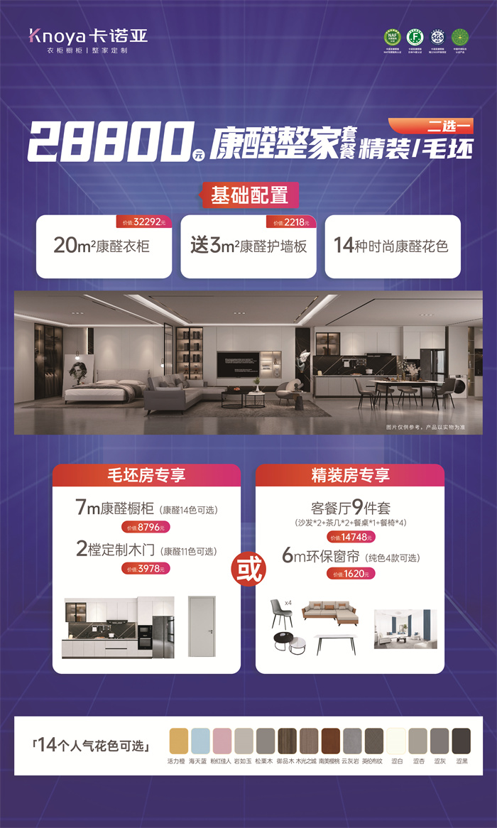 針對毛坯房,卡諾亞精準(zhǔn)推出28800元康醛整家套餐,包括20㎡康醛定制柜+7m康醛櫥柜+2樘定制木門,送3㎡康醛背景墻;針對精裝房,卡諾亞推出28800元康醛整家套餐,包括20㎡康醛定制柜+客餐廳9件套+6m環(huán)保窗簾,送3㎡康醛背景墻。購此套餐,或下定滿30000元獨(dú)享+999元惠送卜居真皮床。