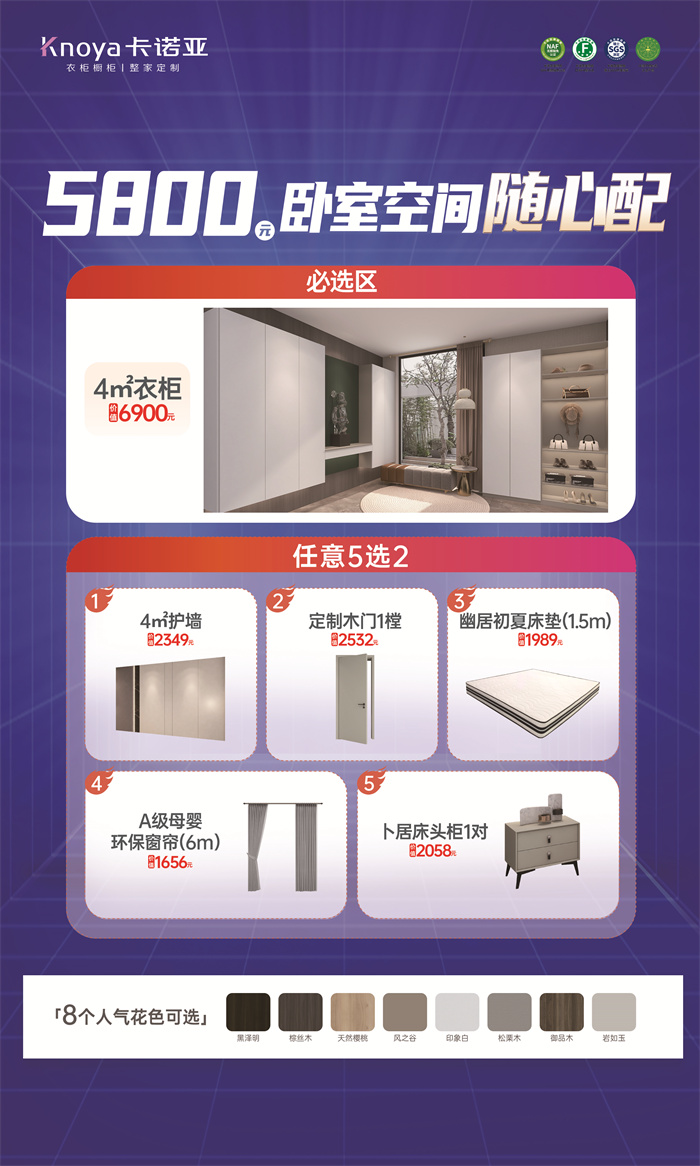 臥室空間隨心配5800元套餐,必選4㎡定制衣柜,8個(gè)時(shí)尚花色可選,分別是黑澤明、棕絲木、天然櫻桃、風(fēng)之谷、印象白、松栗木、御品木、巖如玉。套餐中可以自由選擇的產(chǎn)品包括4m護(hù)墻、1樘定制木門、1.5m護(hù)脊床墊、6米A級(jí)母嬰環(huán)保窗簾、1對床頭柜(5選2),一個(gè)套餐僅需5千多元,就能將柜、墻、門等產(chǎn)品一站配齊,真正實(shí)現(xiàn)“一家搞定,一價(jià)配齊,一體設(shè)計(jì)”。