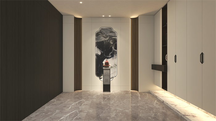 門廳:新中式元素“奢石”地臺(tái)作為點(diǎn)綴,開啟新國潮視覺盛宴。護(hù)墻板燈帶勾勒出簡(jiǎn)約的宮燈形狀,與右邊柜門的燈籠造型拉手遙相呼應(yīng)。對(duì)稱式圓弧轉(zhuǎn)角,將護(hù)墻板與玄關(guān)柜柔美連接,渾然一體,自然天成。