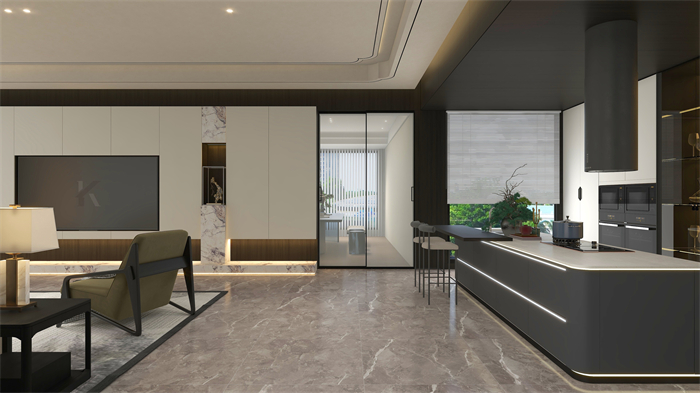 餐廳:餐廚一體化設(shè)計(jì),縮短用餐動(dòng)線,增加交互性,更符合當(dāng)代人的需求。島臺(tái)、吧臺(tái)與餐桌融為一體省空間,圓弧轉(zhuǎn)角營造東方人居的溫潤(rùn)感,鋪陳優(yōu)雅、低調(diào)、現(xiàn)代、隨性的餐廳氛圍。