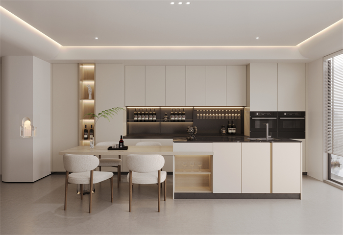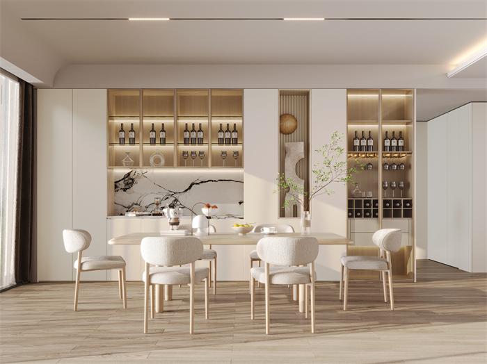2、餐廳:純粹簡(jiǎn)雅的奶油白配色,輕松營(yíng)造愉悅的就餐氛圍。餐酒柜三段式設(shè)計(jì),上半段帶玻璃門(mén)、燈帶,適用于展示美酒、飾品,加上凹槽處藝術(shù)3D掛畫(huà),品味格調(diào)凸顯,高級(jí)感拉滿(mǎn);中間鏤空處臺(tái)面,可用做收納、水吧臺(tái)、小電器等;下半段抽屜較多,收納更強(qiáng)。