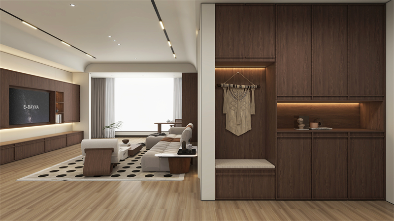 清秋胡桃與骨骼線搭配設(shè)計(jì),從入戶起就開始鋪墊復(fù)古的基調(diào)。中間鏤空、換鞋凳的設(shè)計(jì),讓鞋柜實(shí)用性與裝飾性兼?zhèn)洌_放區(qū)集掛、坐、置三重功能于一體。