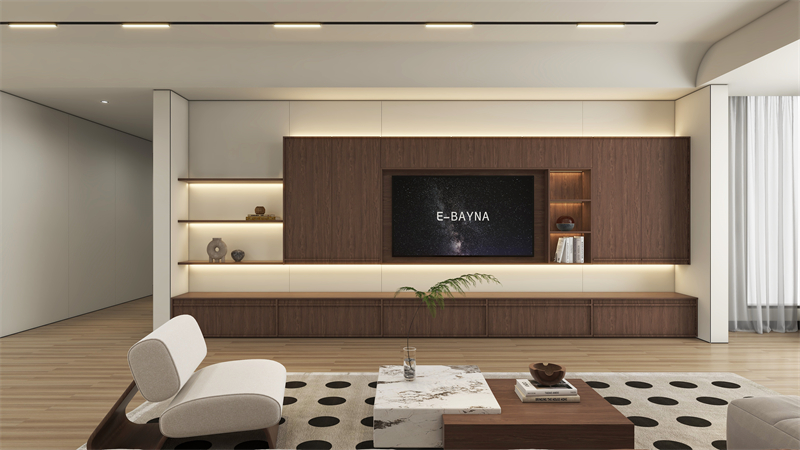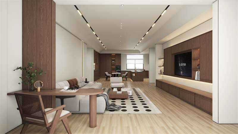 滿墻電視柜+懸空設(shè)計(jì),將收納做到隱形的同時(shí),也展現(xiàn)出了中古風(fēng)的輕盈溫馨,復(fù)古色胡桃木的加入,讓中古氣息越發(fā)濃郁。