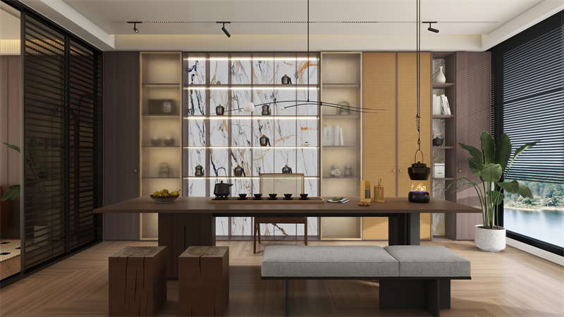 在清淺時(shí)光里,一手煙火一手詩意,任窗外花開花落,云來云往,自是余味無盡,萬般愜意。茶室以素色調(diào)為主,深色的天然紋理厚實(shí)而流暢,打造質(zhì)樸的空間,帶來的不僅僅是原始的茶味,更是一種隨性的灑脫意境。