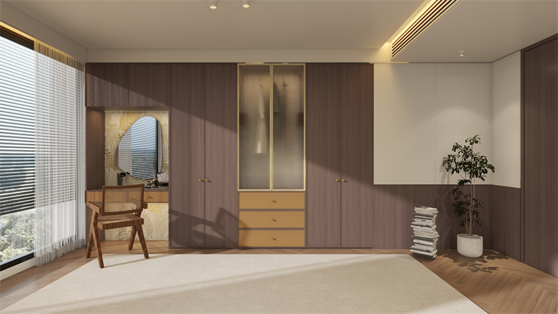 整個(gè)空間以深色木紋打底,大面積的木紋拼框柜門,既保留中古經(jīng)典特色,也兼?zhèn)涔诺渑c現(xiàn)代美感。衣柜局部應(yīng)用長虹玻璃,嵌入梳妝臺(tái),搭配內(nèi)嵌燈帶,透光不投影的朦朧感,驚艷每一天。