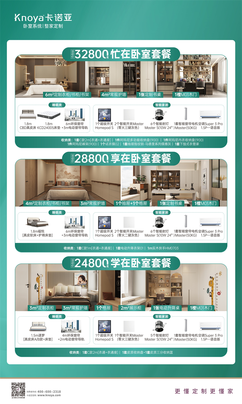 卡諾亞此次315活動,攜手多個高端品牌如芝華仕、CBD、云米科技等,為消費(fèi)者提供一站式的家居解決方案?;顒悠陂g,卡諾亞除了以上2大套餐,還精心推出32800元忙在臥室套餐、28800元享在臥室套餐、24800元學(xué)在臥室套餐等,涵蓋臥室系統(tǒng)+整家定制兩大品類,包括定制柜、護(hù)墻板、全屋家具以及智能家電,聯(lián)手更多大牌,真正實現(xiàn)“整家定制更高配,全屋家具更滿配,智能家電更全配”的理念。
