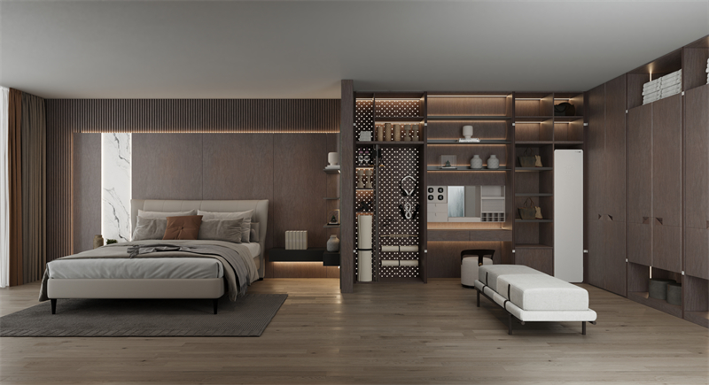 產(chǎn)品亮點(diǎn):1.松韻、耀金、秋香木等溫潤色調(diào)巧妙組合,構(gòu)筑“雅而不寡” 的視覺基調(diào),營造溫馨高雅的空間氛圍。2.采用進(jìn)口榆木木皮,呈現(xiàn)自然美觀的質(zhì)感,且具備環(huán)保健康、耐用性強(qiáng)、個(gè)性造型等優(yōu)點(diǎn).3.金屬水性漆環(huán)保健康, 3底2面的涂裝工藝,裝飾空間質(zhì)感更高級。4.獨(dú)特斜向切割面與門型設(shè)計(jì),搭配 25mm超導(dǎo)發(fā)光層板、宣紙發(fā)光板及ABA夾心工藝等,演繹“Less is more”的輕高定美學(xué),展現(xiàn)精致簡約的空間格調(diào)。