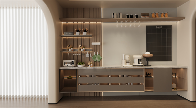 布局設(shè)計(jì)上,羅亞全屋定制更是打破了家居就該有固定模樣的陳規(guī)。餐廳與陽臺(tái)不再是割裂的存在,而是被打造成聯(lián)動(dòng)的“咖啡區(qū) + 品酒區(qū)”;早晨在這里沖一杯手沖,用咖啡香喚醒元?dú)猓灰雇碚{(diào)一杯利口酒,讓微醺消解疲憊。