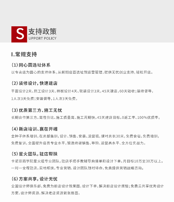 從事全屋定制行業(yè),經(jīng)驗方面是比較重要的,如果缺乏經(jīng)驗的話,很多店面問題是難以處理的。所以這時候品牌就是你的引路燈,一般是會給到加盟店提供到設(shè)計、銷售、經(jīng)營、服務(wù)等方面的指導的,可全面提升店面人員的專業(yè)水平、服務(wù)能力、獲客能力,讓店面可以輕松化解各種難題。