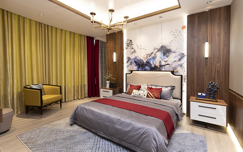 卡諾亞丨東方雅閣·臥房采用隔斷柜隔開主臥和衣帽間功能區(qū),相對獨(dú)立、互不干擾,一邊是全身試衣鏡,一邊是梳妝臺(tái),中式屏風(fēng)點(diǎn)綴,讓隔斷柜成為臥房一道靚麗的風(fēng)景線。歐式墻裙、中式臥榻、床頭3D中式山水裝飾畫、皇家黃與中國紅搭配的窗簾、對稱均衡的設(shè)計(jì),讓臥房別具東方人文氣質(zhì)。