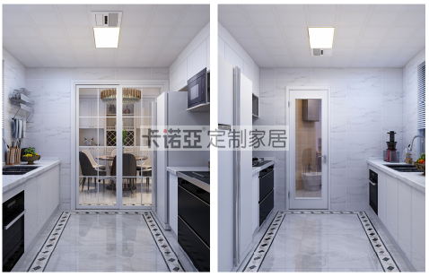 改造后,采用兩條平行線型廚柜格局,將烹飪區(qū)和洗切區(qū)隔開,方便轉(zhuǎn)身,廚房空間明顯擴(kuò)大。
