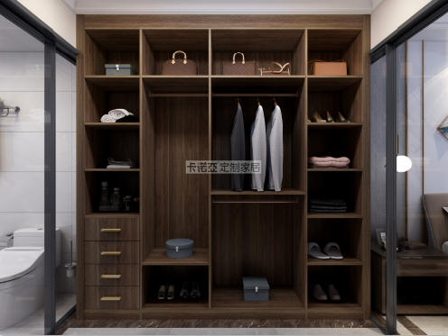 衣帽間設(shè)計(jì)在主臥與主衛(wèi)之間,采用透明玻璃移門隔斷,讓主臥視野更為開闊通暢,防止?jié)駳馇秩胍旅遍g及臥室,同時方便洗漱完畢可直接更衣、睡覺。