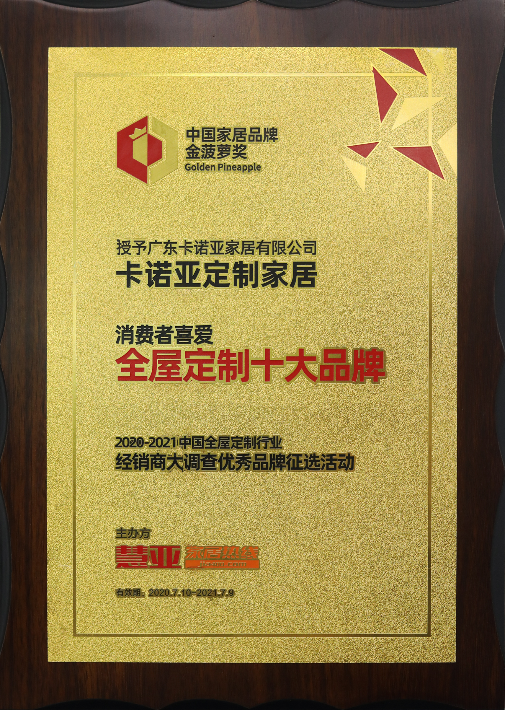 7月10日,2020第五屆中國大定制家居營銷發(fā)展論壇暨家居品牌金菠蘿獎盛典在中國建博會(廣州)舉行??ㄖZ亞副總經(jīng)理兼營銷總經(jīng)理賴永精,作為發(fā)言嘉賓出席會議,并分享“提升數(shù)字化能力,助力家居業(yè)發(fā)展”主題內(nèi)容。同時,卡諾亞憑借專注定制家居19年的企業(yè)實(shí)力和品牌魅力,榮獲“中國家居品牌金菠蘿獎·消費(fèi)者喜愛全屋定制十大品牌”獎項(xiàng)。