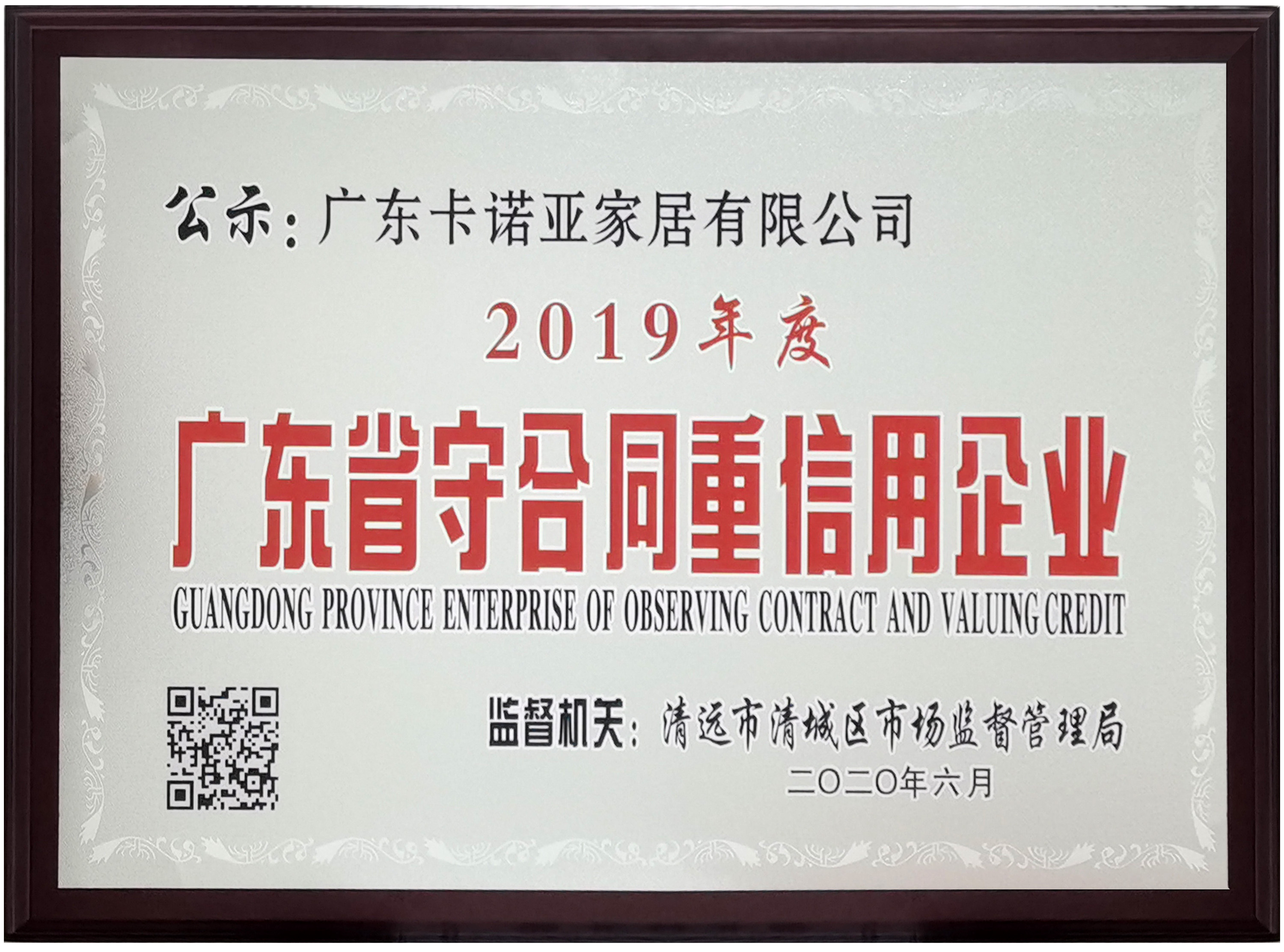 近日,廣東省清遠市清城區(qū)市場監(jiān)督管理局對廣東省守合同重信用企業(yè)進行公示,廣東卡諾亞家居有限公司憑借良好的信譽與契約精神,依靠19年來的誠信經營與優(yōu)質服務,順利通過最終評審,獲得“2019年度廣東省守合同重信用企業(yè)”殊榮,這是對公司誠信管理的高度肯定和誠信服務的極大鼓勵。